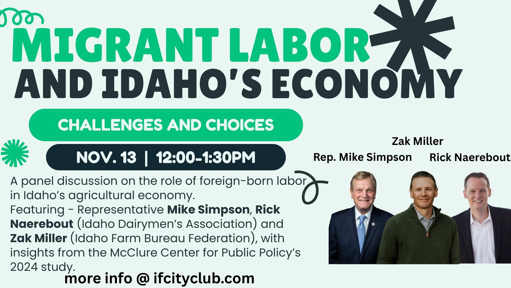 City Club of Idaho Falls invites you to a timely panel discussion on the essential role of foreign-born labor in Idaho agriculture. Drawing on findings from the McClure Center for Public Policy’s 2024 study. Idaho relies on tens of thousands of unauthorized immigrants—35,000 in 2021—mostly in agriculture and construction. While they fill labor gaps, their presence raises questions about enforcing immigration laws, protecting jobs for legal residents, and ensuring fair wages. This conversation will explore the challenges and opportunities shaping Idaho’s workforce and economy.